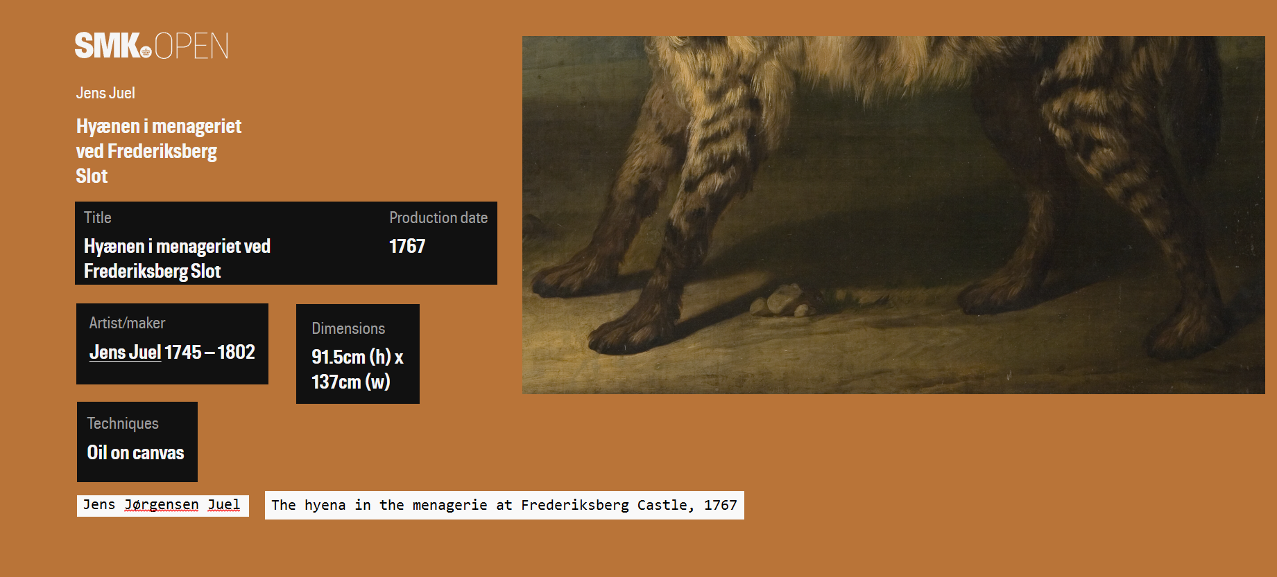 Jens Jørgensen Juel, The hyena in the menagerie at Frederiksberg Castle, 1767