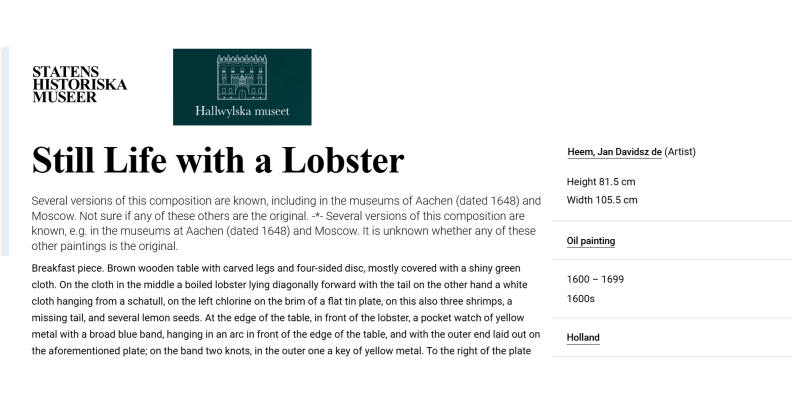 • The displayed painting is a crop from Jan Davidsz. de Heem, Still Life with Oysters and Grapes, 1653.