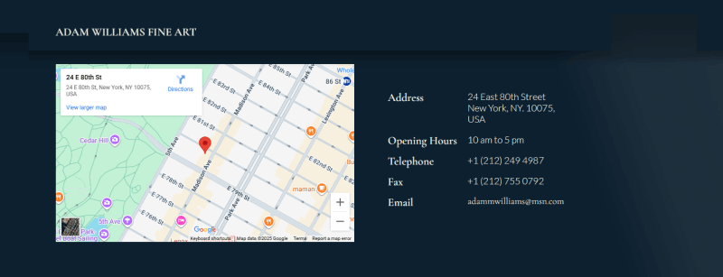 Adam Williams Fine Art opened in September 1998 on New York’s Upper East Side in close proximity to The Metropolitan Museum of Art and the preeminent collectors of Old Master Paintings in North America. The gallery deals in fine European Old Master paintings from the fourteenth to the mid nineteenth centuries.