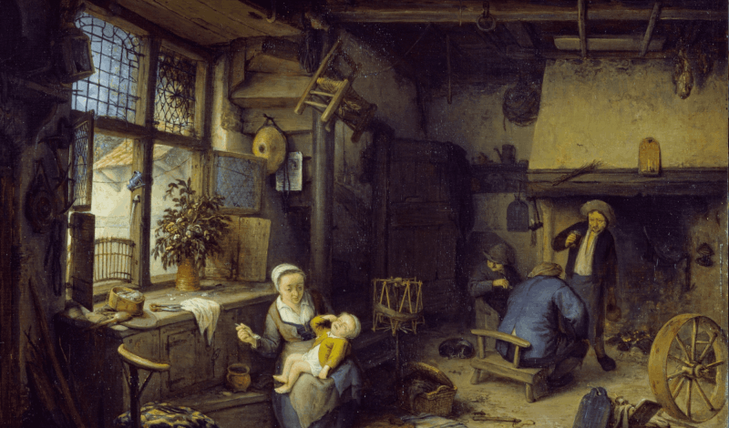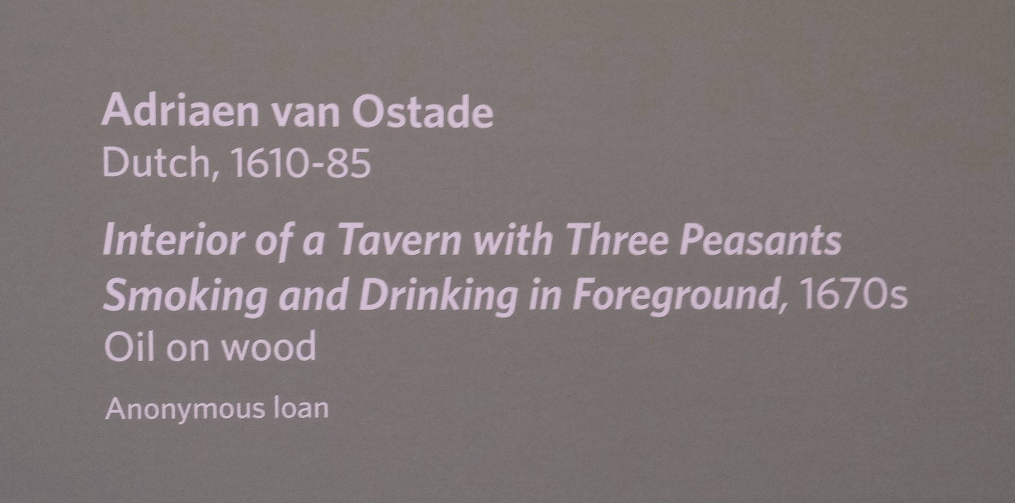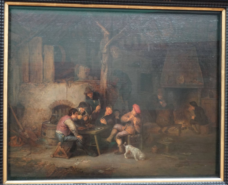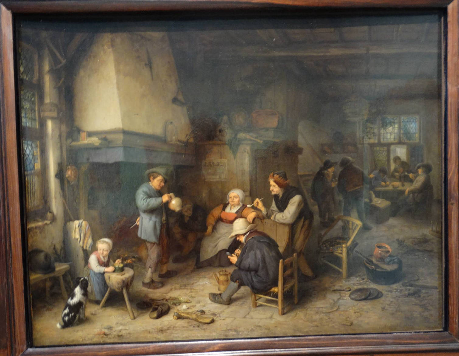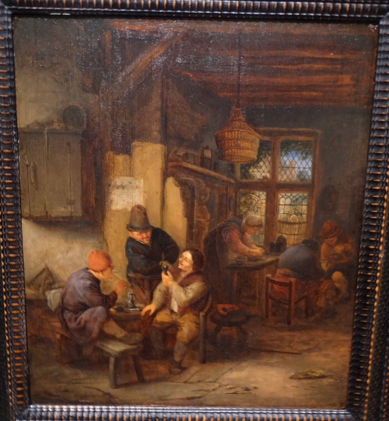 Adriaen Van Ostade - Interior of a Tavern with Three Peasants Smoking and Drinking in Foreground (1670s)