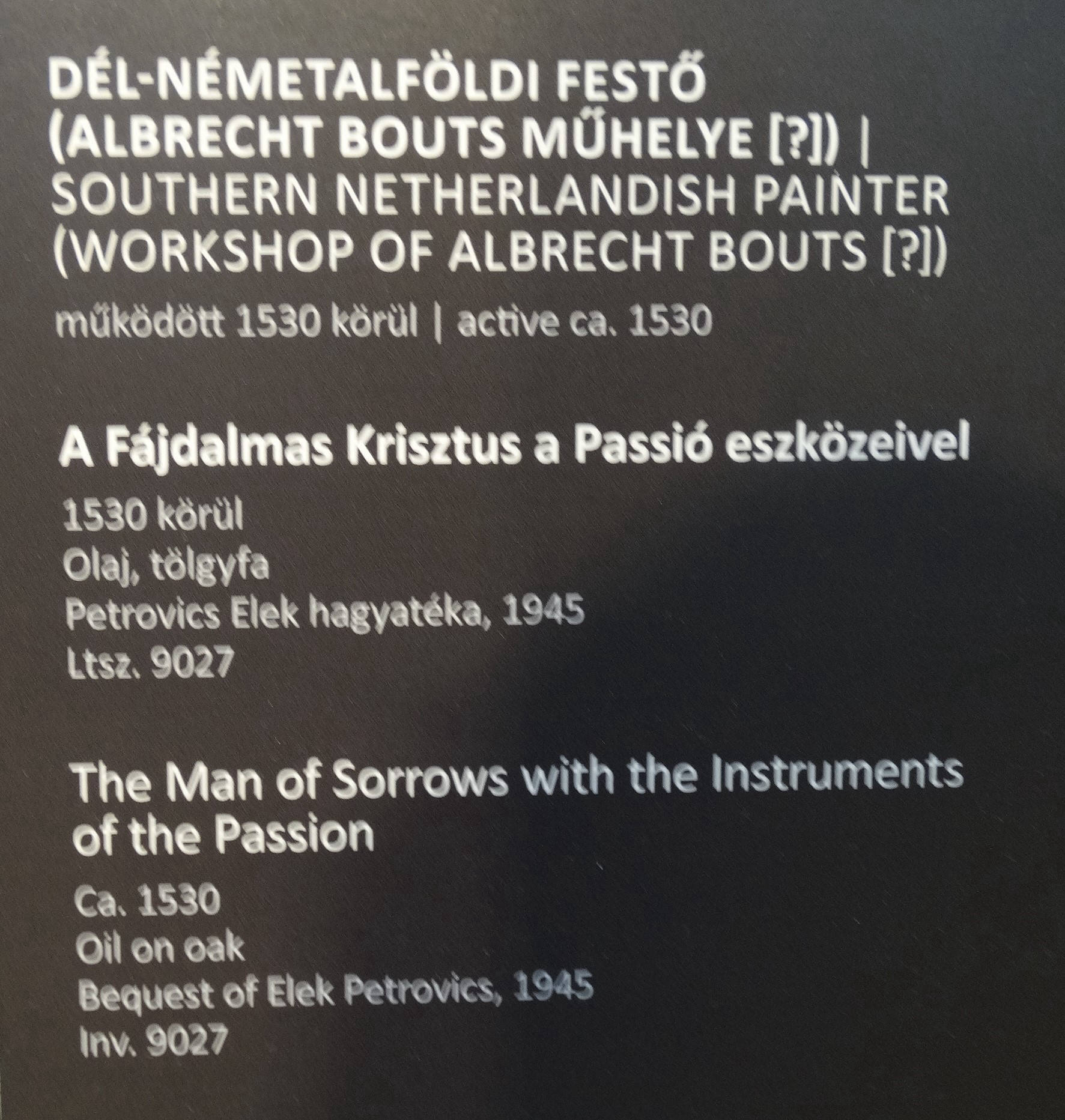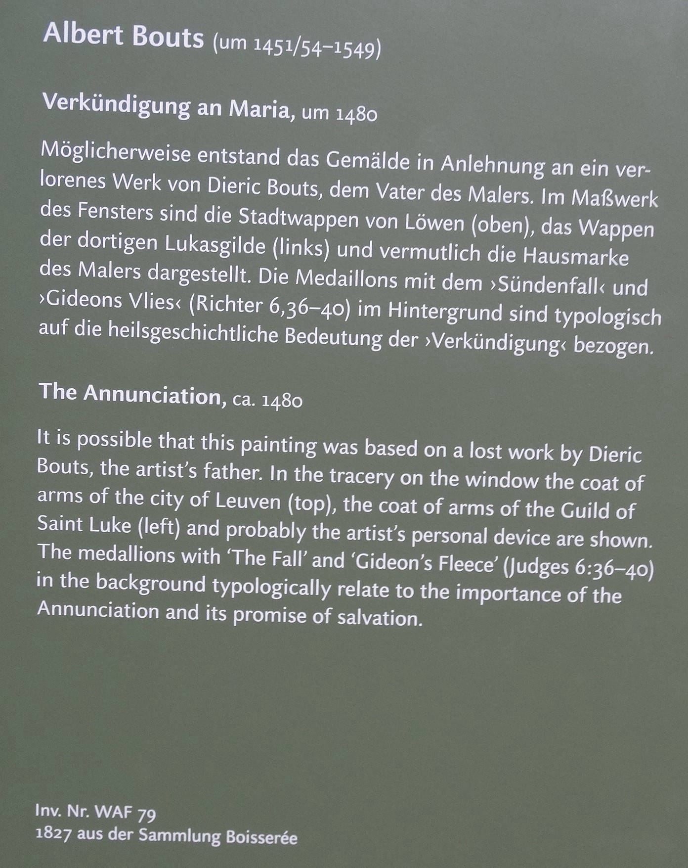 was a Flemish painter of the Early Netherlandish era. He was born into a family of painters in Leuven. Aelbrecht’s father was Dieric Bouts the Elder (c. 1415-1475), and his brother was Dieric Bouts the Younger (c. 1448-1490). Jan Bouts (c. 1478-c. 1530), son of Dieric Bouts the Younger, also became a painter. Dieric Bouts the Younger inherited his father’s shop in 1475, while Aelbrecht established his own workshop, also in Leuven. Whereas Dieric the Younger continued in his father's style, Aelbrecht developed his own unmistakable style with strong colors, rich texture and fine details. He died in Leuven.