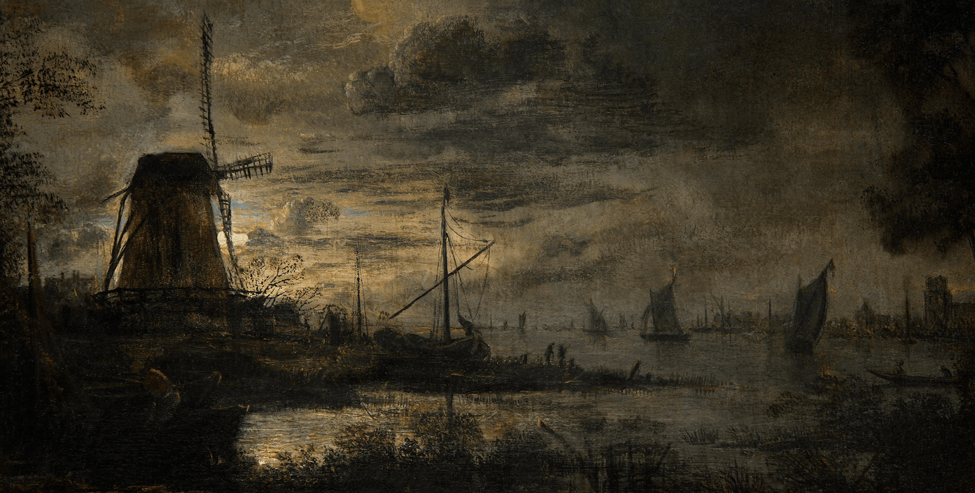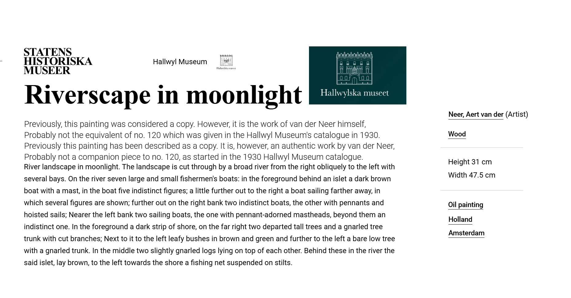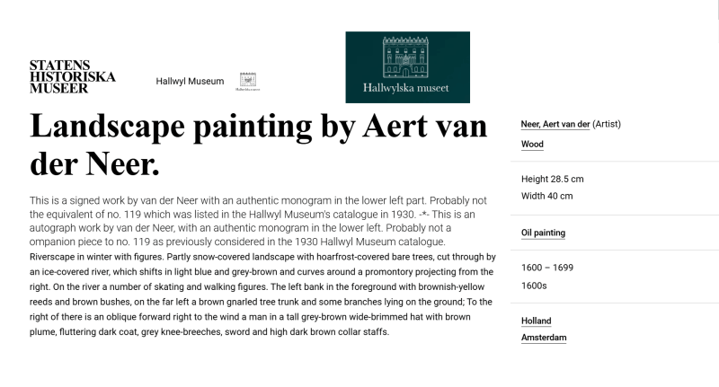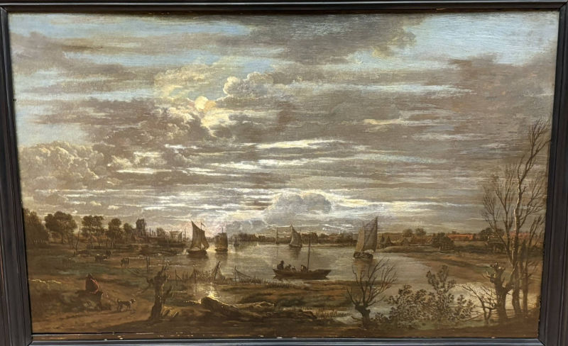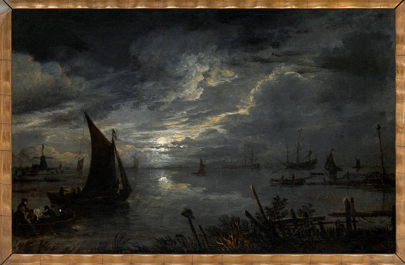 • The displayed painting is a crop from: Aert van der Neer, Wooded River Landscape 1645.