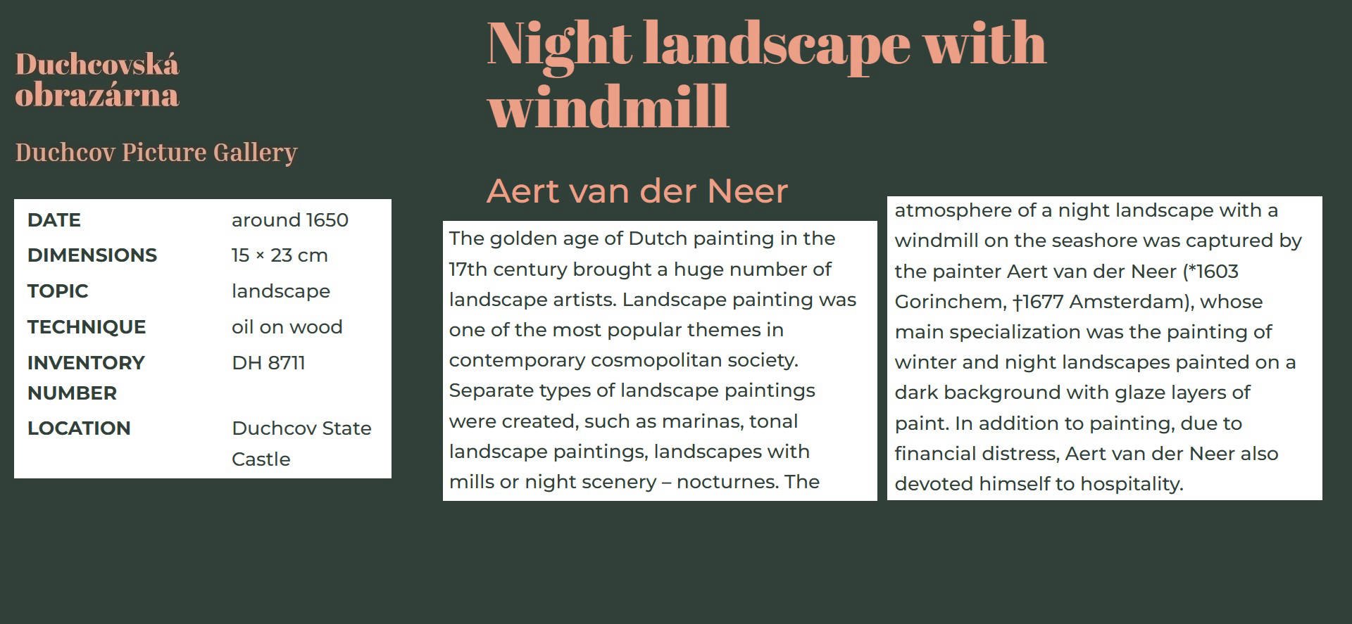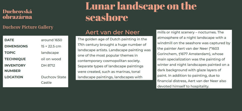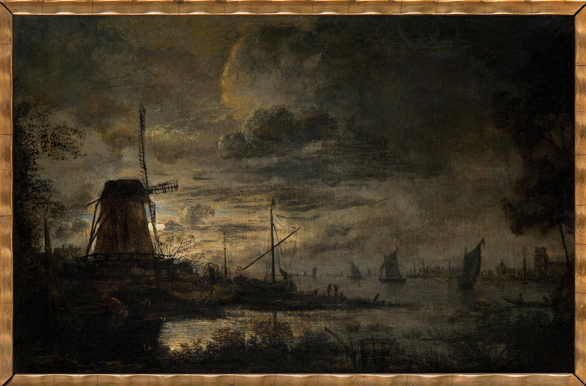 • The displayed painting is a crop from: Aert van der Neer, Wooded River Landscape 1645.