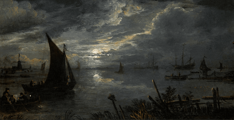 Aert van der Neer, River Landscape with Ships at Moonrise, ca. 1660 – 1670