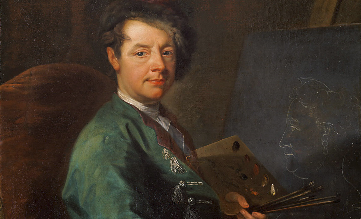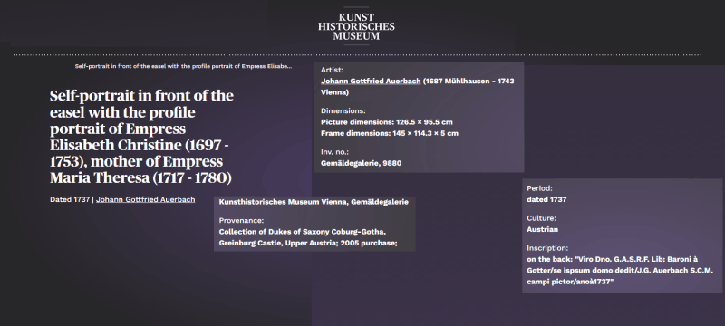 • The displayed painting is a crop from: Johann Gottfried Auerbach, Self-portrait in front of the easel, with the profile portrait of Empress Elisabeth Christine (1697 - 1753), mother of Empress Maria Theresa (1717 - 1780), 1737.