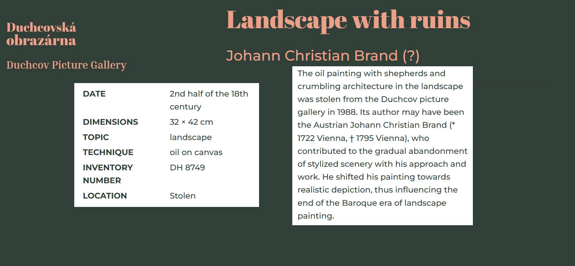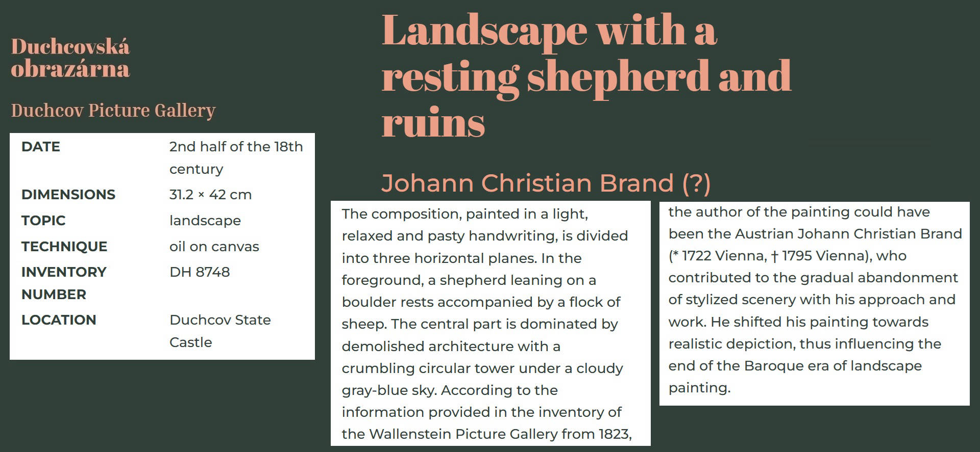 • Works by Johann Christian Brand are contained in Laxenburg Castle, Österreichische Galerie in Belvedere Palace, Vienna Art History Museum, Museum of Military History, National Gallery Prague, Göttweig, Klosterneuburg, Museum at the Schottenstift, Liechtenstein and Harrach galleries.