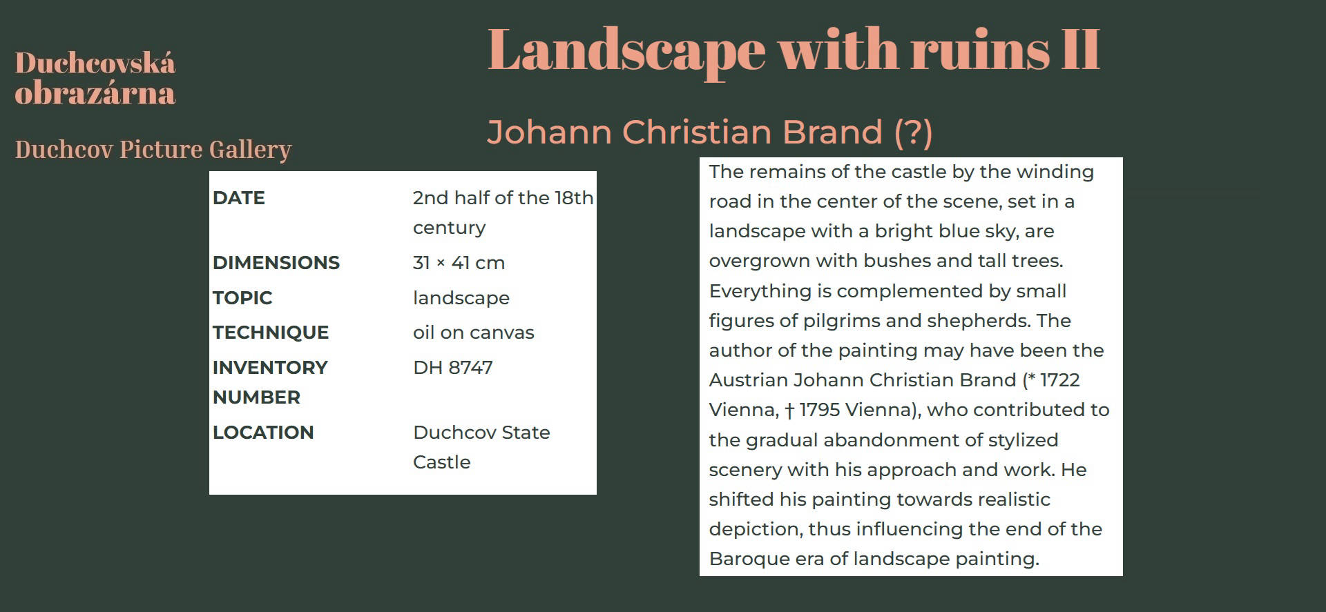 • Johann Christian Brand influenced ending the baroque era of landscape painting.