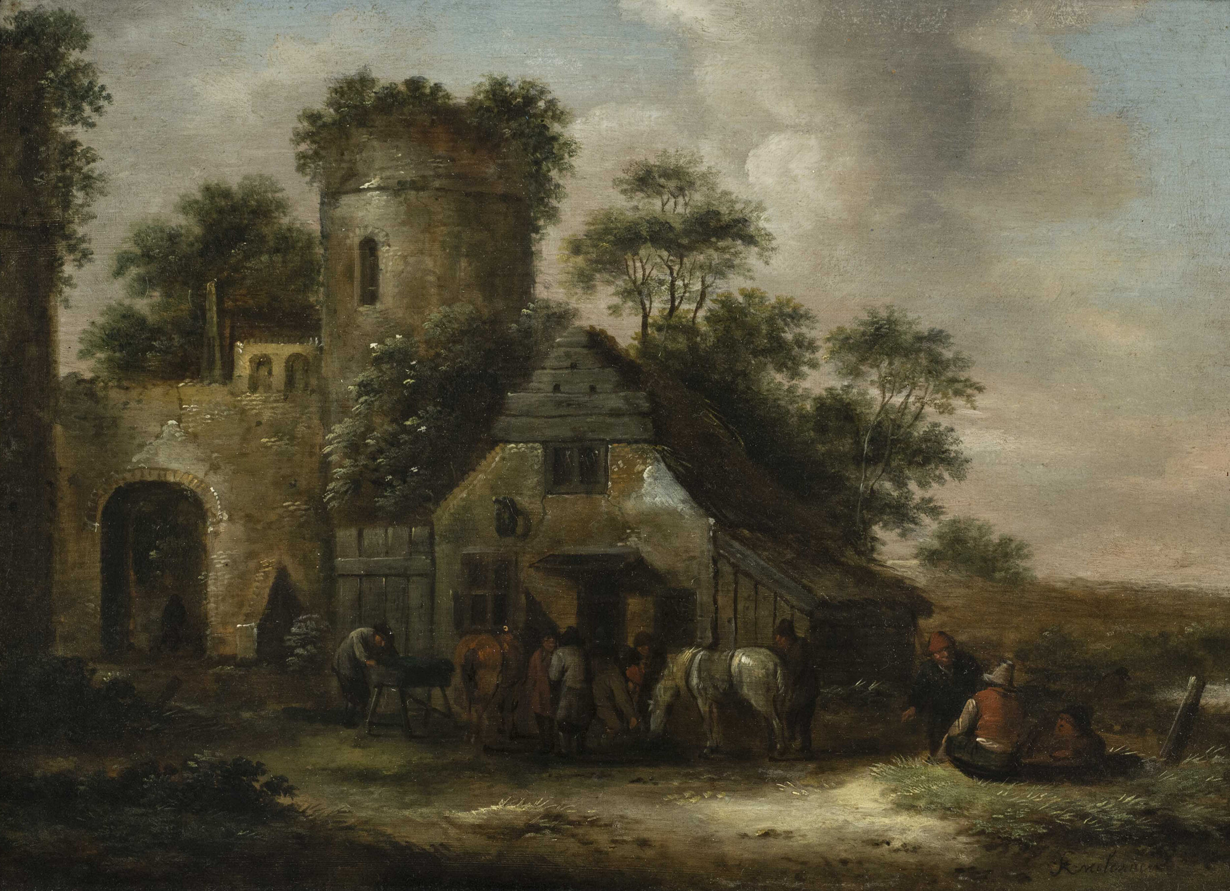 Claes Molenaer, Figures Outside an Inn by the Town Walls in Summertime