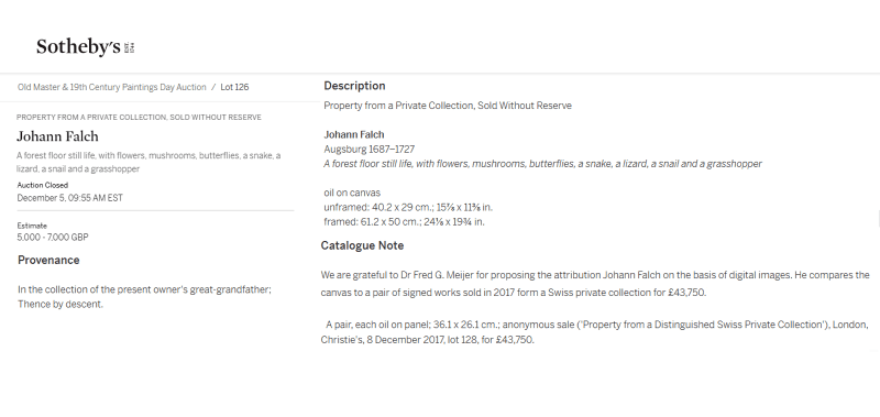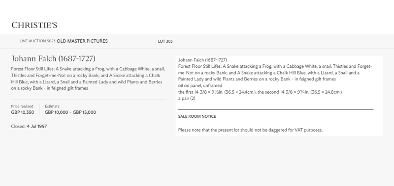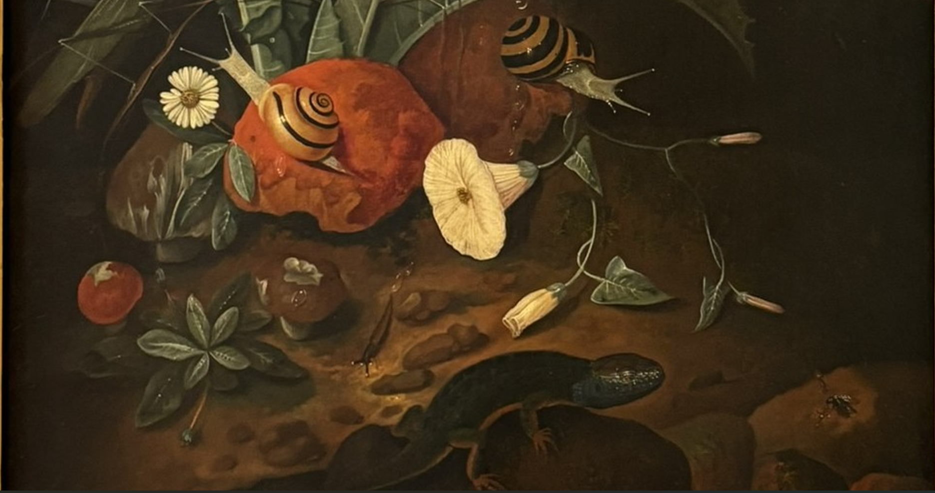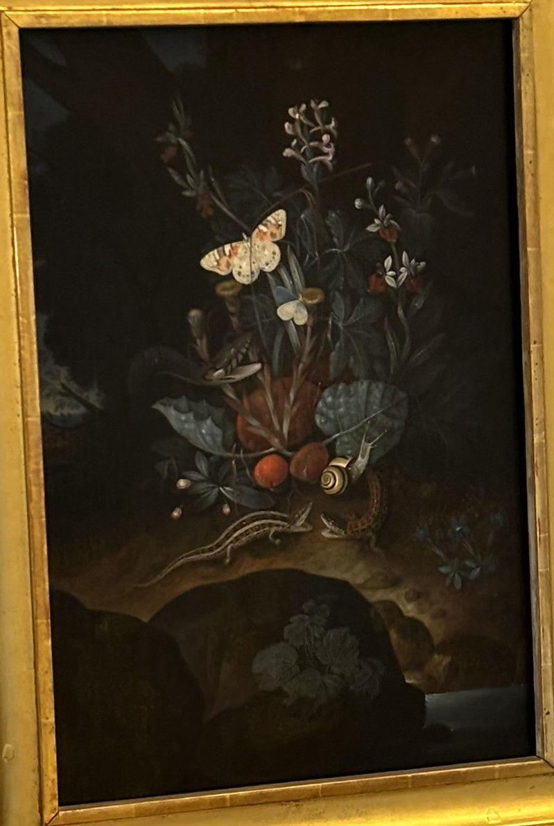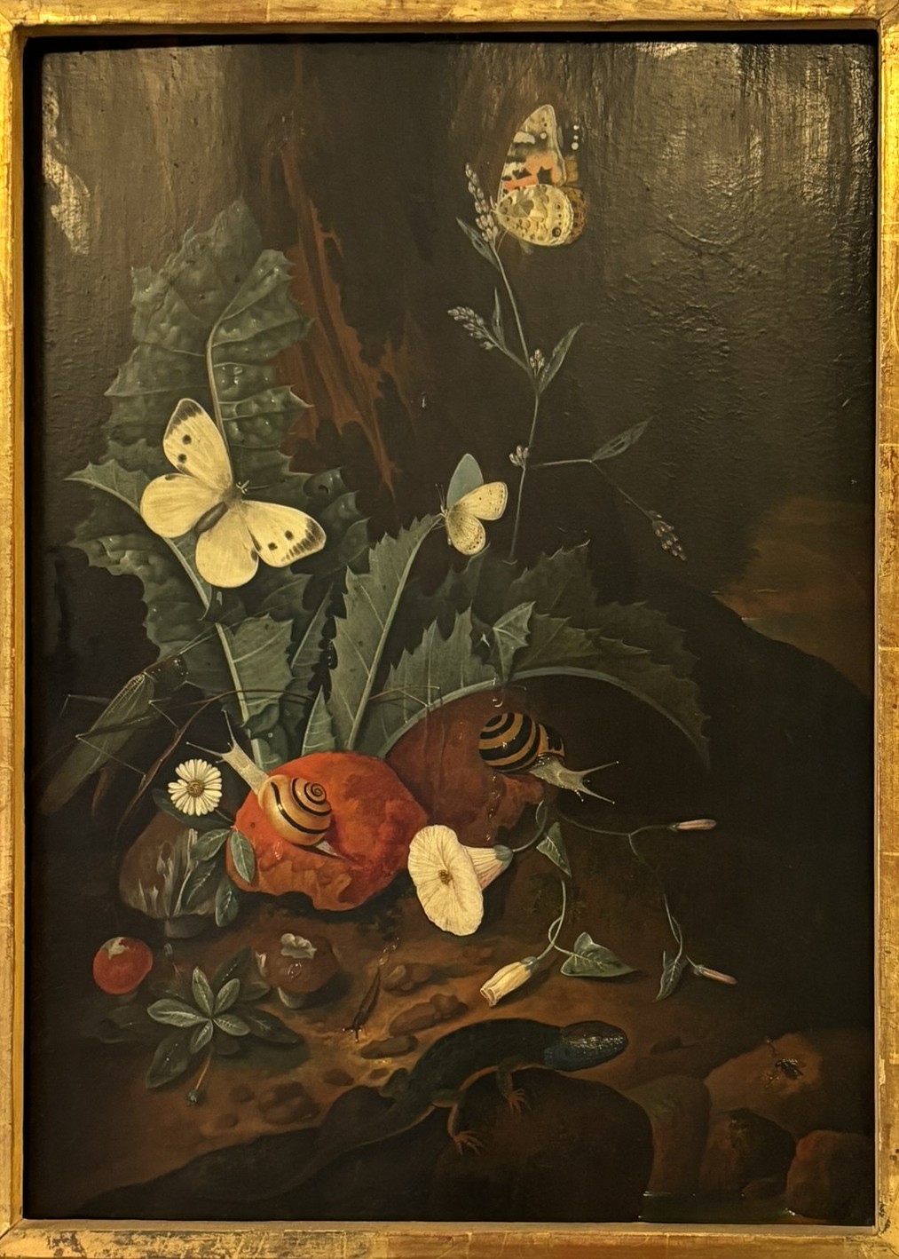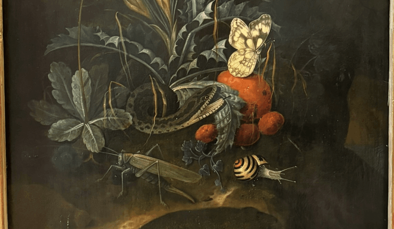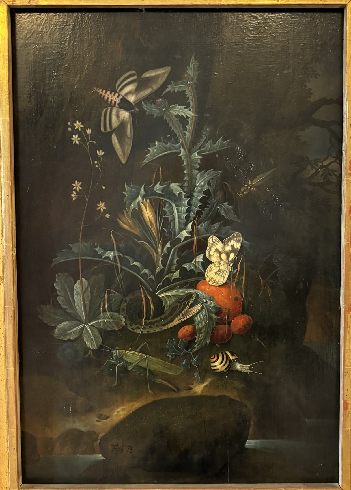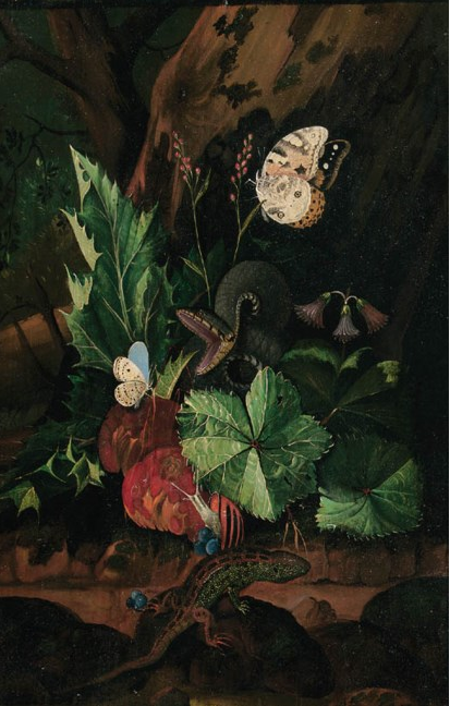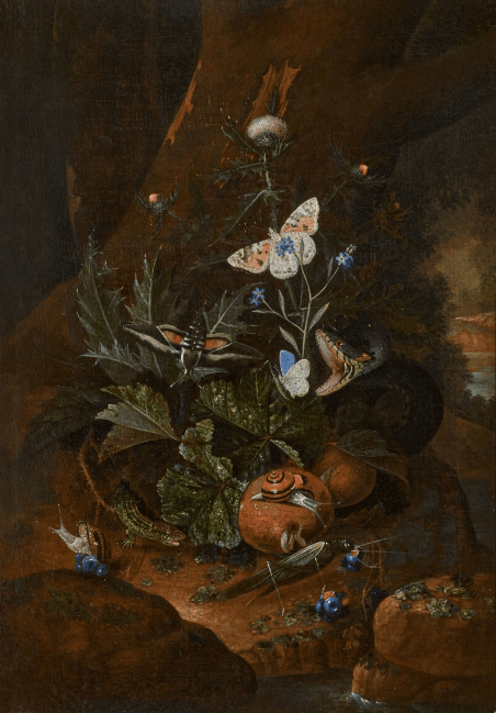 Johann Falch, Forest Floor Still Lifes, A Snake attacking a Frog, with a Cabbage White, a snail