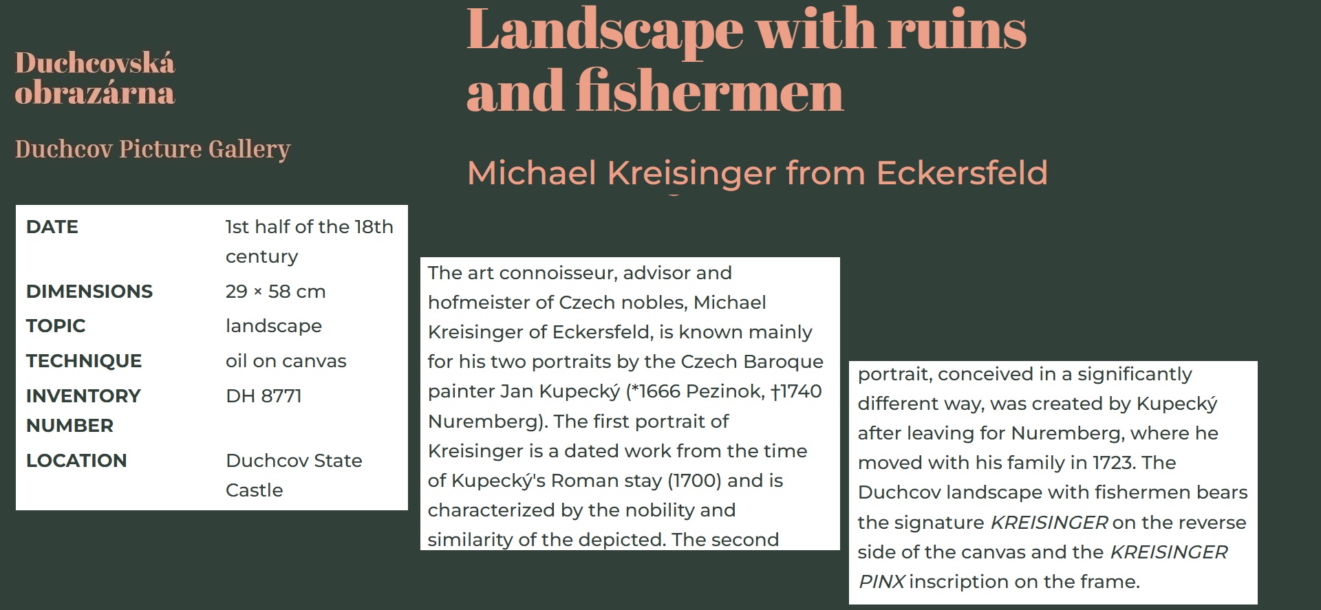 • The displayed painting is a crop from Jan Kupecký, Portrait of Michael Kreisinger of Eckersfeld in his youth, 1700.