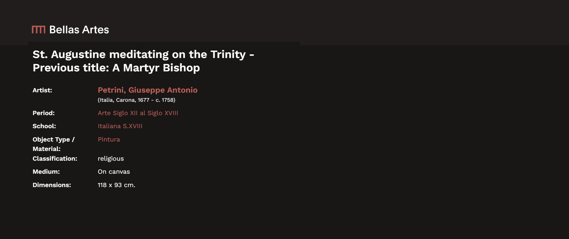 • While born in Carona in Canton Ticino and died in Lugano, both in Switzerland, Petrini belongs to the Northern Italian or Lombard heritage of baroque painting.
