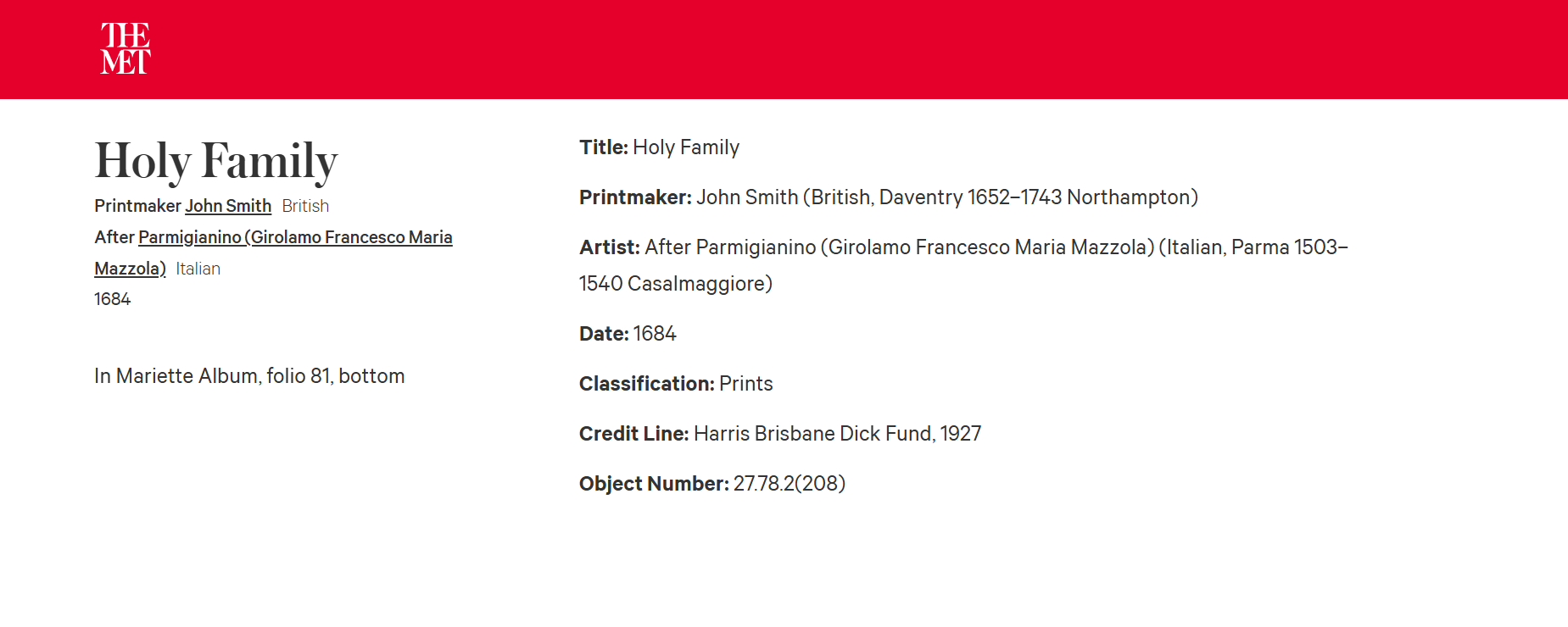 • Smith's latest print appears to have been the portrait of the young Prince William, Duke of Cumberland, after Joseph Highmore, dated 1729.