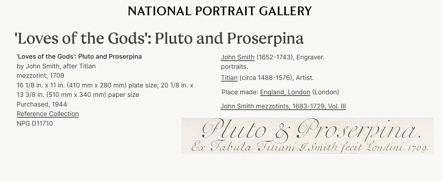 John Smith, after Titian, 'Loves of the Gods' Pluto and Proserpina, 1709