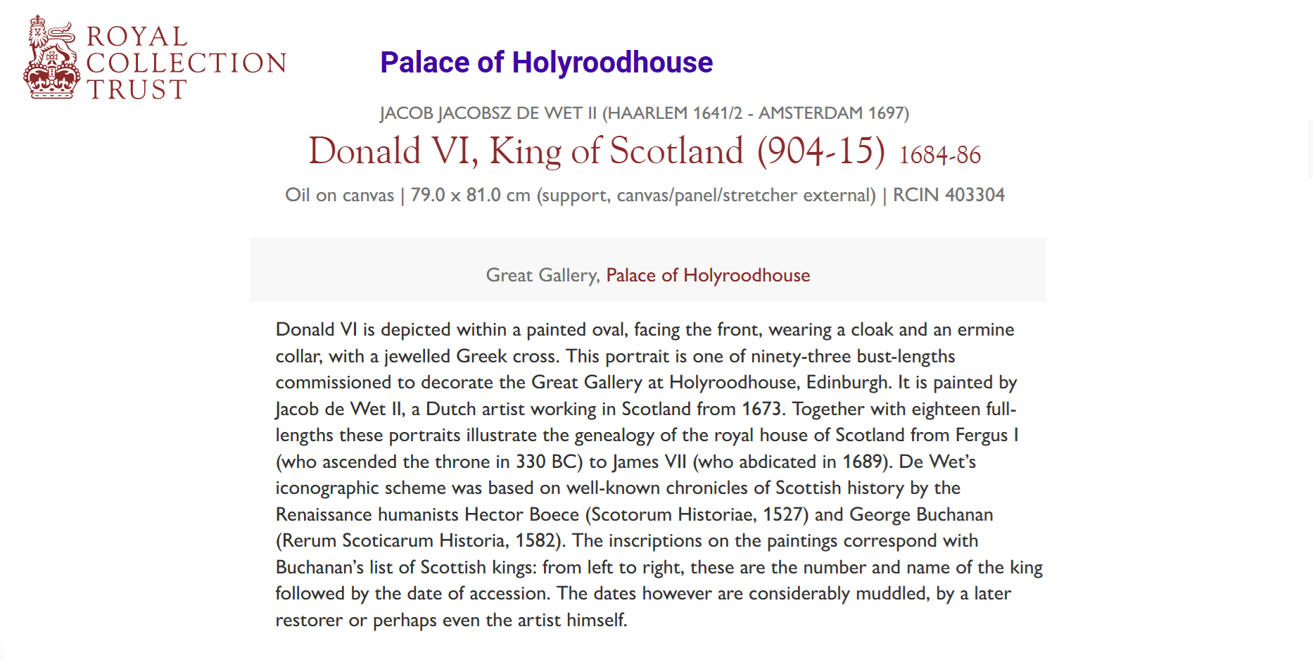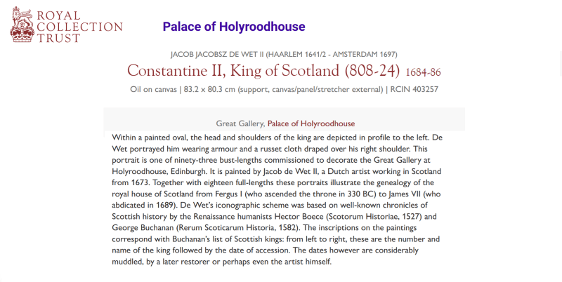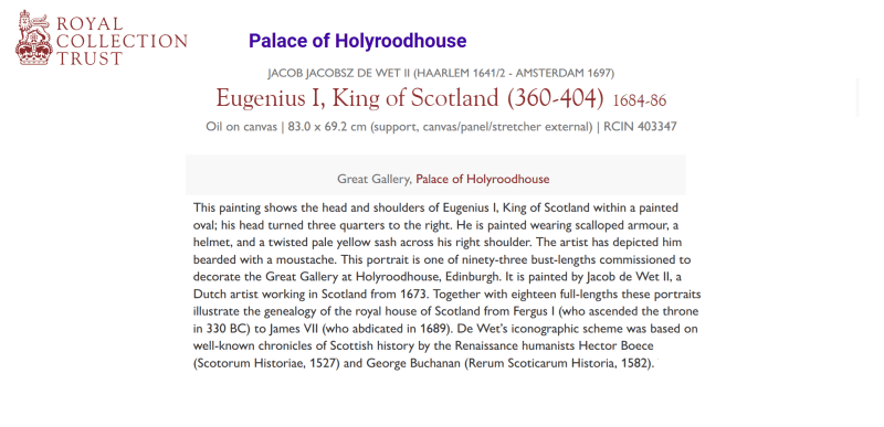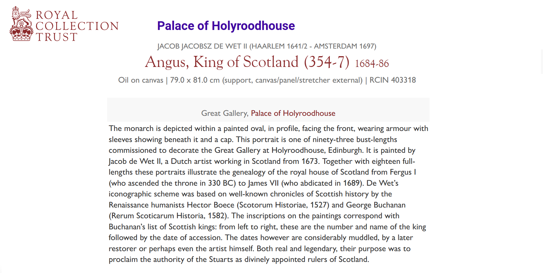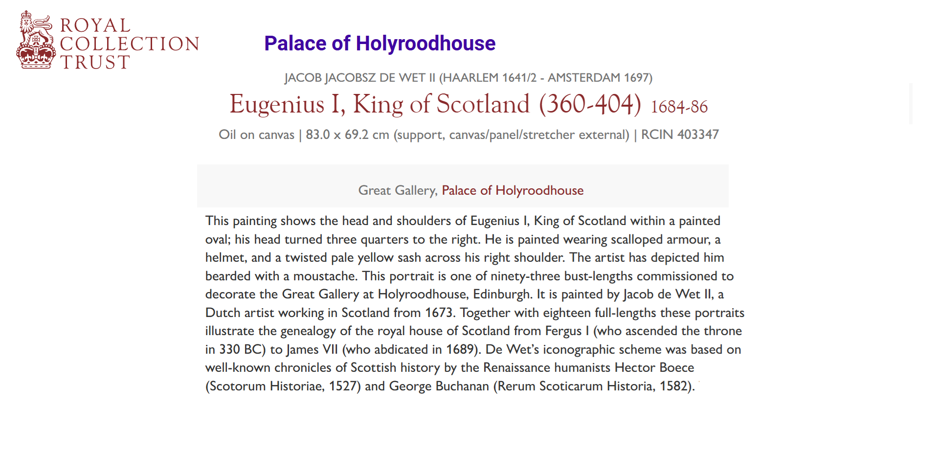 • In 1684 de Wet signed a contract with Hugh Wallace, the Royal Cashkeeper, on 26 February which bound him to produce, for £120 per annum and within the period of two years, 110 portraits of Scottish monarchs.