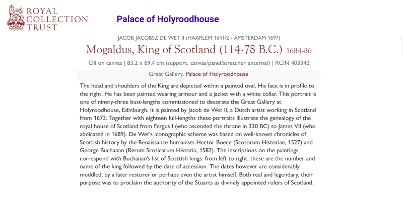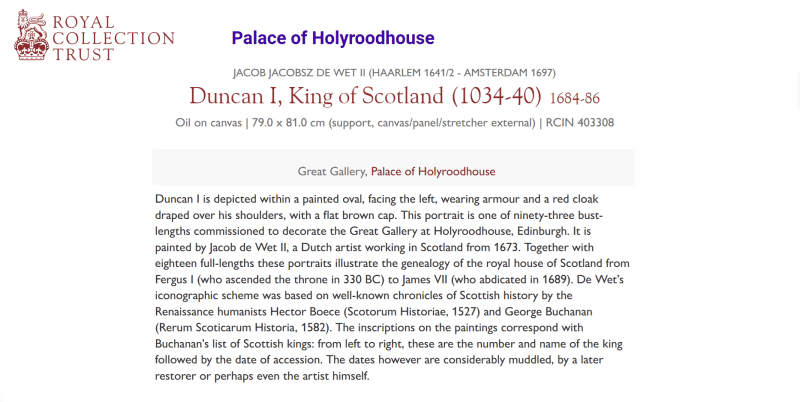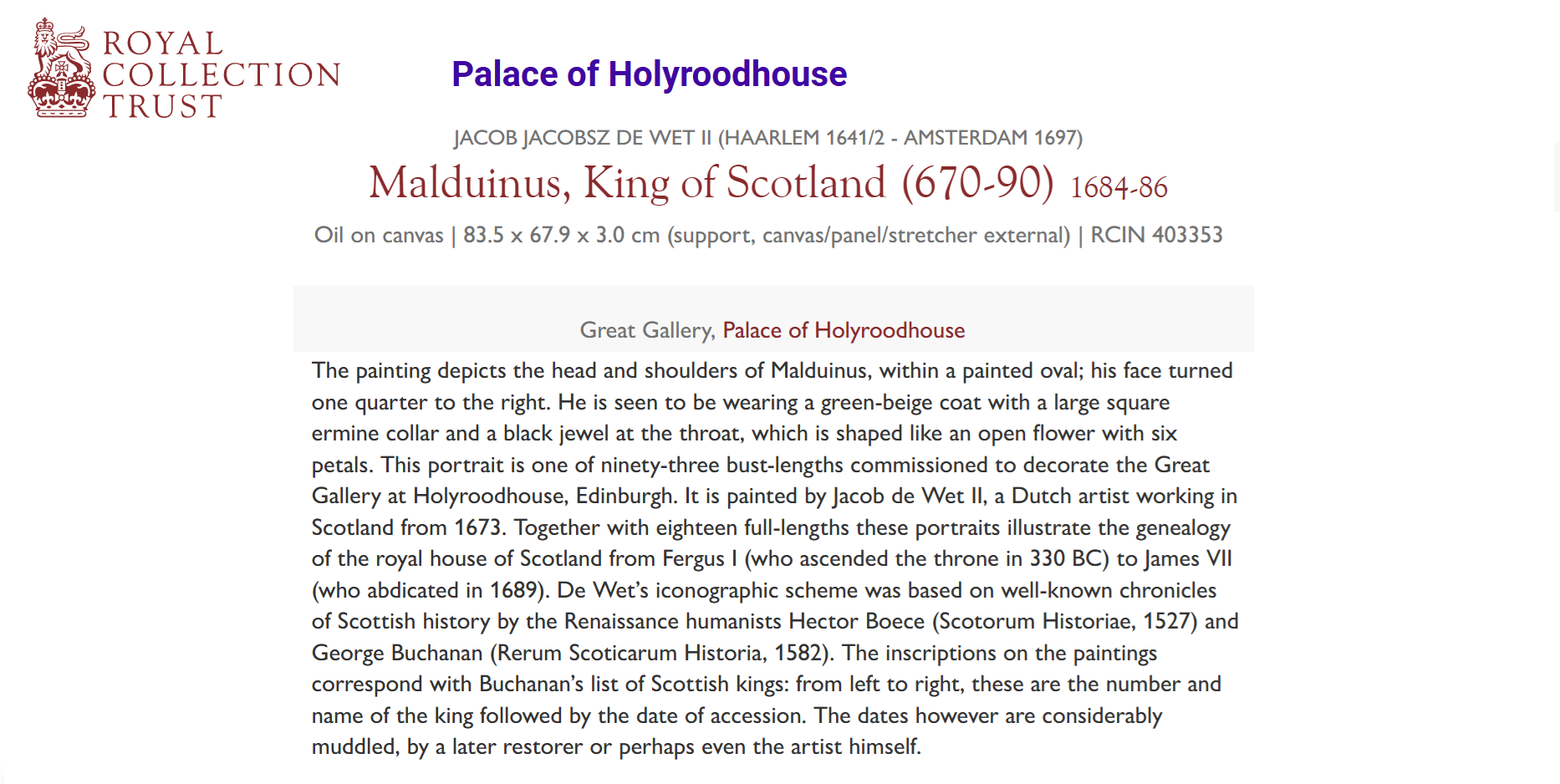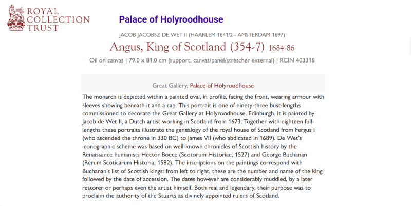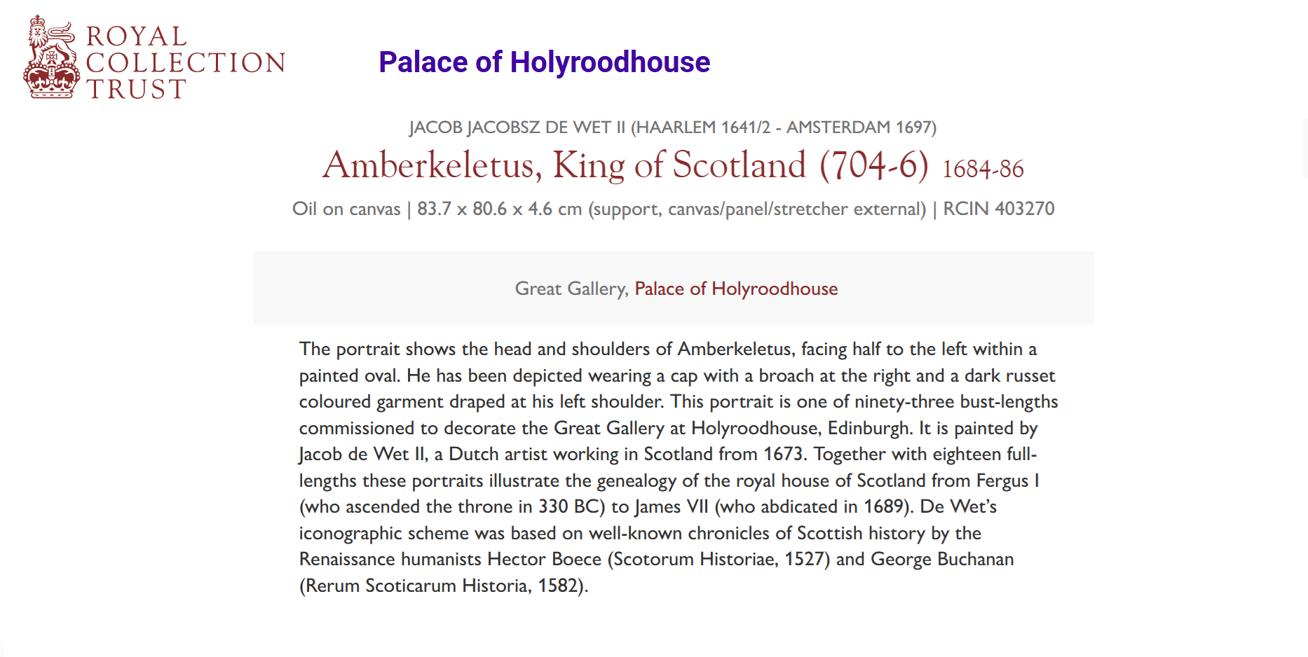 • In 1684 de Wet signed a contract with Hugh Wallace, the Royal Cashkeeper, on 26 February which bound him to produce, for £120 per annum and within the period of two years, 110 portraits of Scottish monarchs.