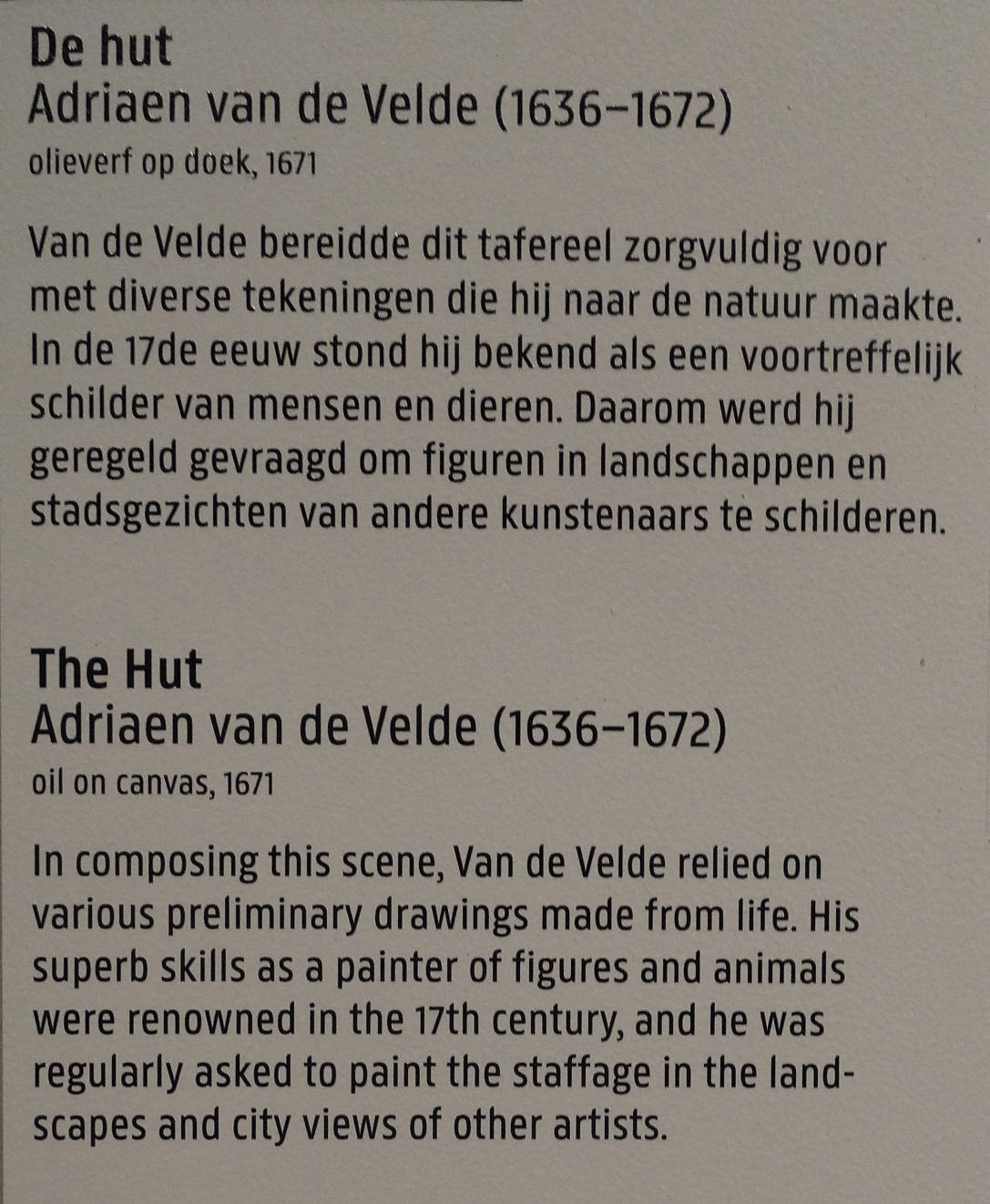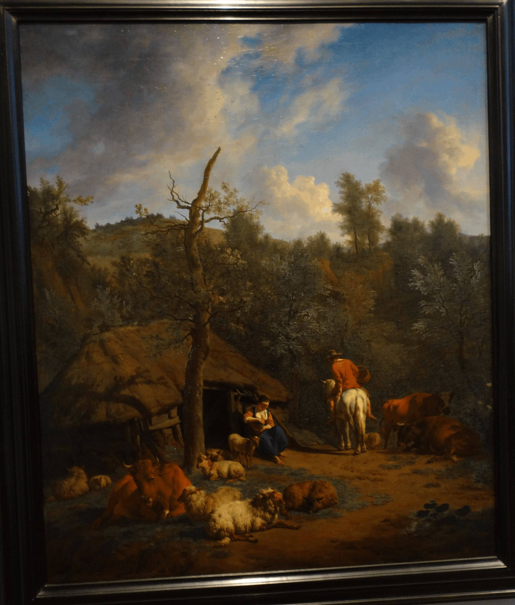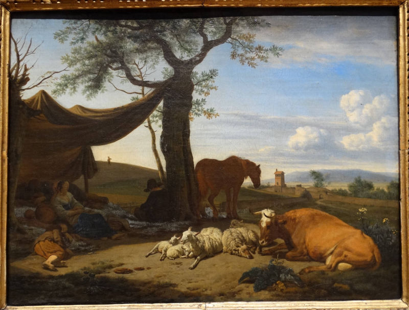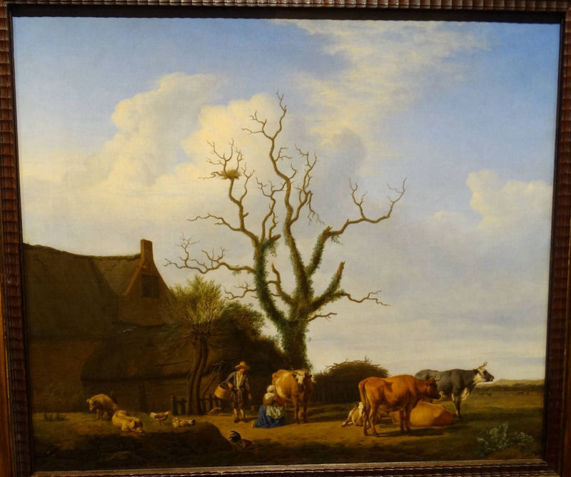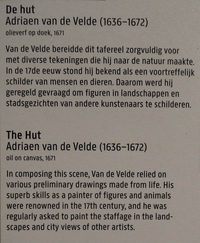 was a Dutch animal and landscape painter, son of Willem van de Velde the Elder and brother of Willem van de Velde the Younger, the marine painter. Adriaen did not want to become a marine painter so he was trained in the studio of Jan Wynants, the landscape painter. There he made the acquaintance of Philip Wouwerman, who is believed to have aided him in his studies of animals, and to have exercised a powerful and beneficial influence upon his art. Having made exceptionally rapid progress, he was soon employed by his master to introduce figures into his landscape compositions, and he rendered a similar service to Hobbema, Ruisdael, Verboom and other contemporary artists. According to Houbraken, he died while in collaboration with Jan van der Heyden and Frederik de Moucheron, painting animals on their paintings. The displayed painting is a crop from Peasants Drinking at a Window, c. (1640-70).
