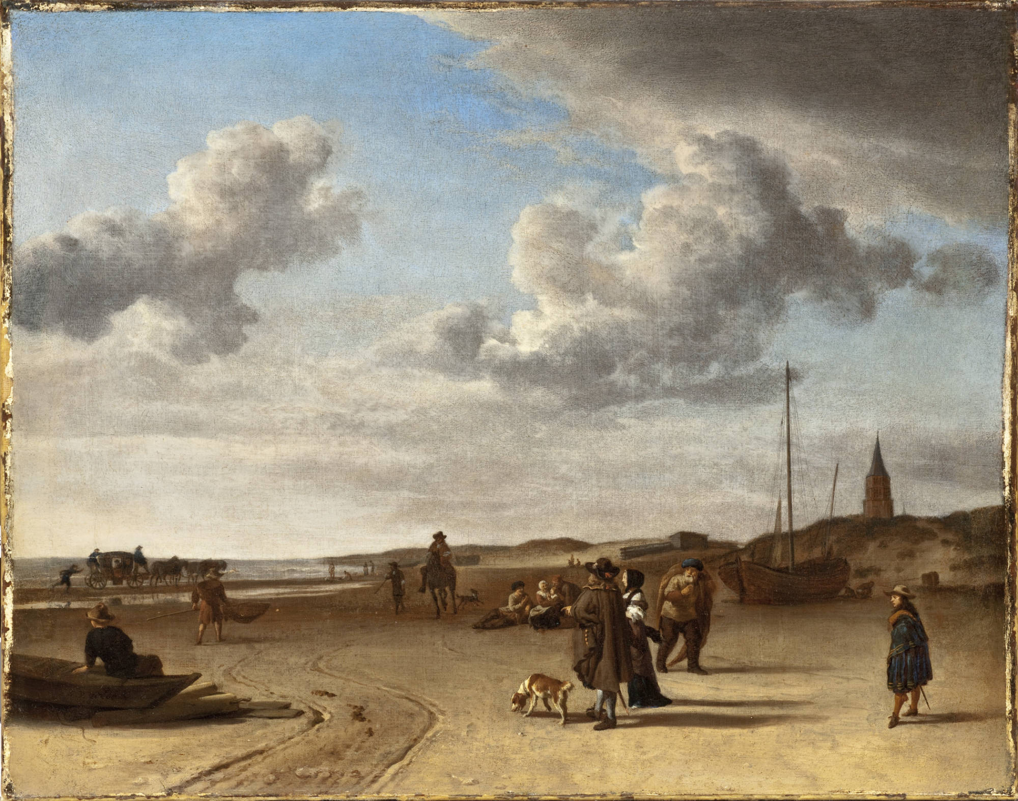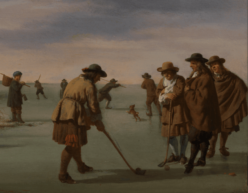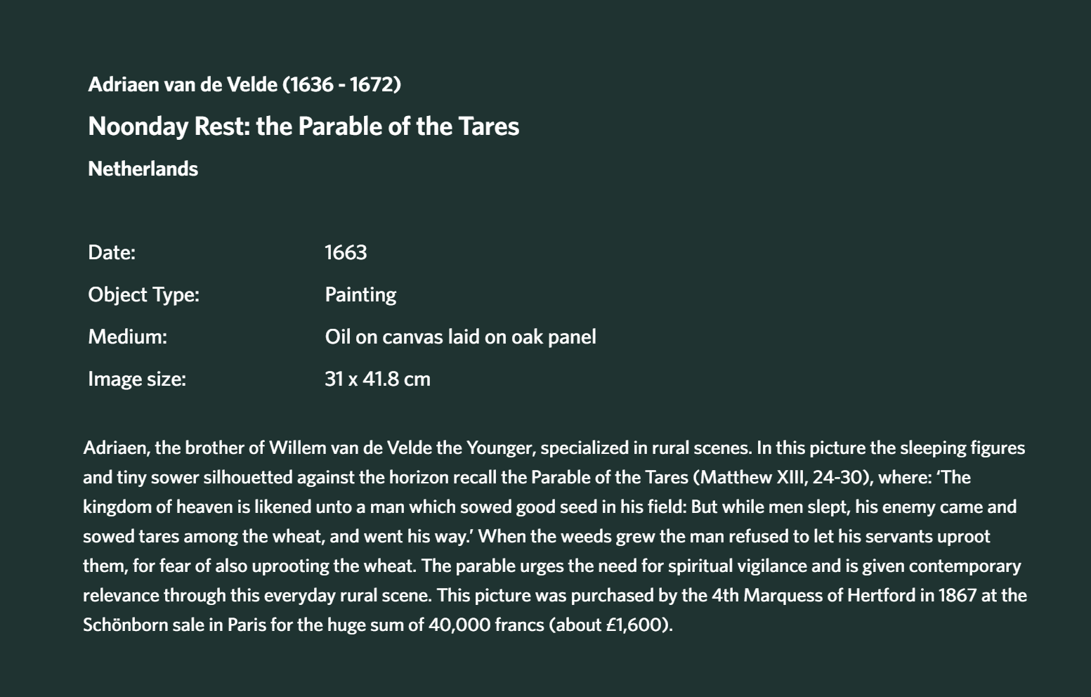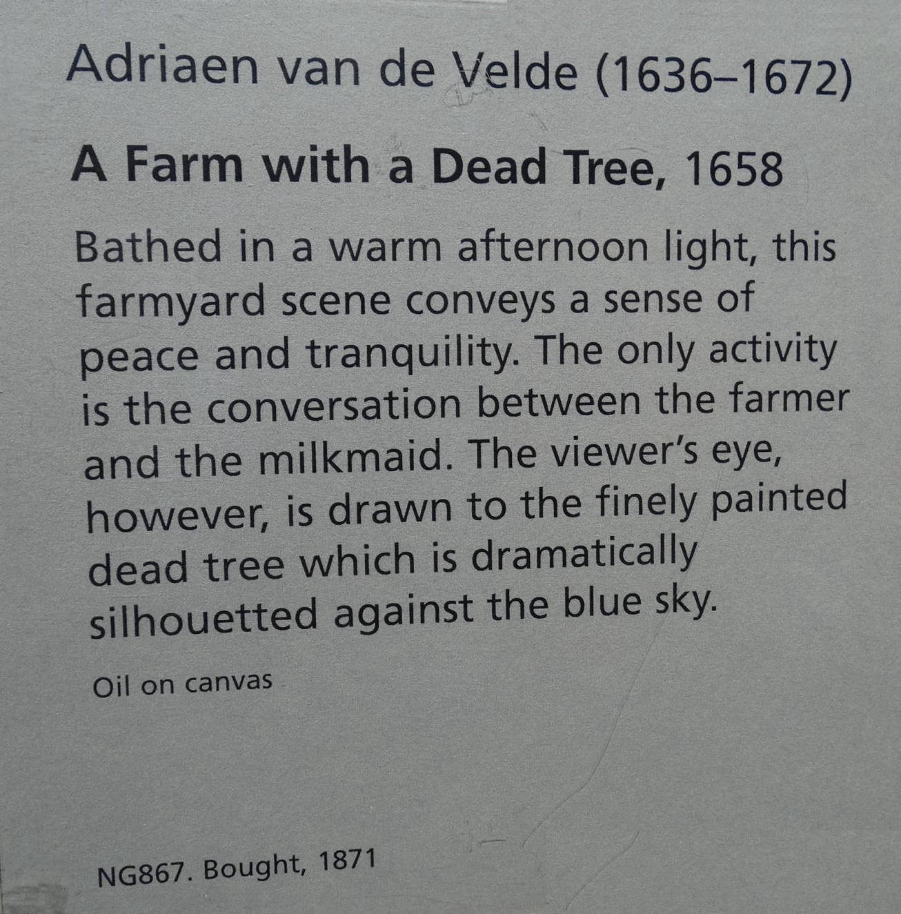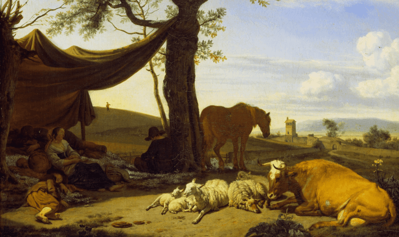 was a Dutch animal and landscape painter, son of Willem van de Velde the Elder and brother of Willem van de Velde the Younger, the marine painter. Adriaen did not want to become a marine painter so he was trained in the studio of Jan Wynants, the landscape painter. There he made the acquaintance of Philip Wouwerman, who is believed to have aided him in his studies of animals, and to have exercised a powerful and beneficial influence upon his art. Having made exceptionally rapid progress, he was soon employed by his master to introduce figures into his landscape compositions, and he rendered a similar service to Hobbema, Ruisdael, Verboom and other contemporary artists. According to Houbraken, he died while in collaboration with Jan van der Heyden and Frederik de Moucheron, painting animals on their paintings. The displayed painting is a crop from Peasants Drinking at a Window, c. (1640-70).